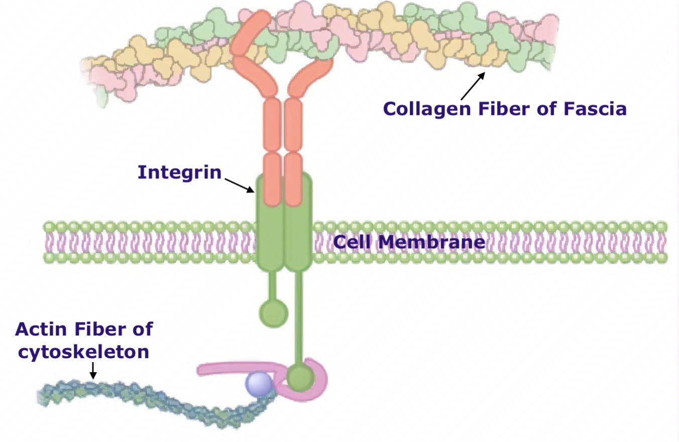 Integrin ProteinSpanning the cell membrane are proteins called integrins — molecular bridges that reach outward into the fascial matrix and inward to the cytoskeleton. Through integrins, the tension in a collagen fiber in your fascia is directly, mechanically continuous with the tension in a protein filament inside your cell. The body is one tensegrity system, operating simultaneously at the scale of the whole body and the scale of the molecule.